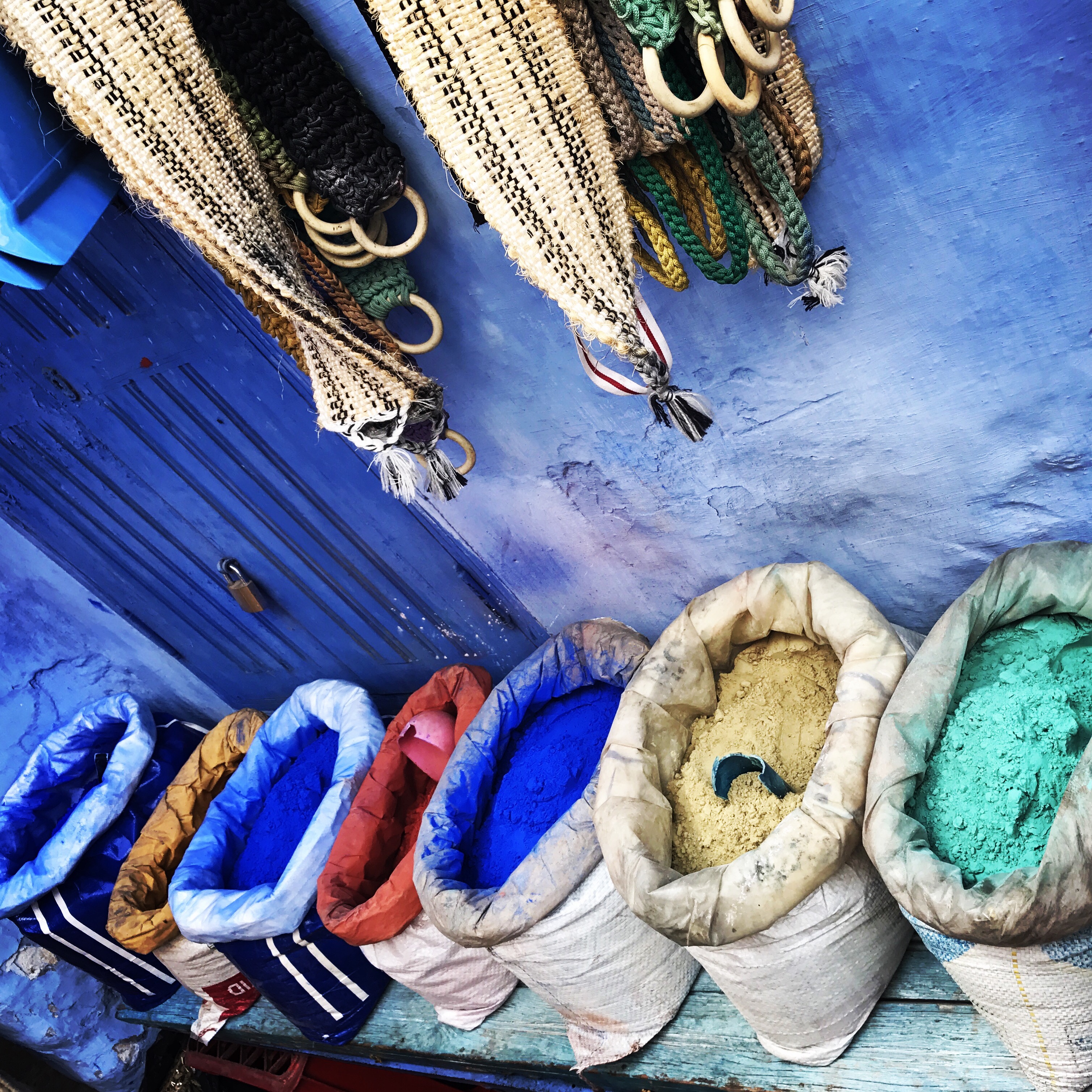 The houses are painted blue as part of a Jewish belief that it would remind residents of the importance of God and to bring them closer. You can find paint powder in many parts of the Medina.