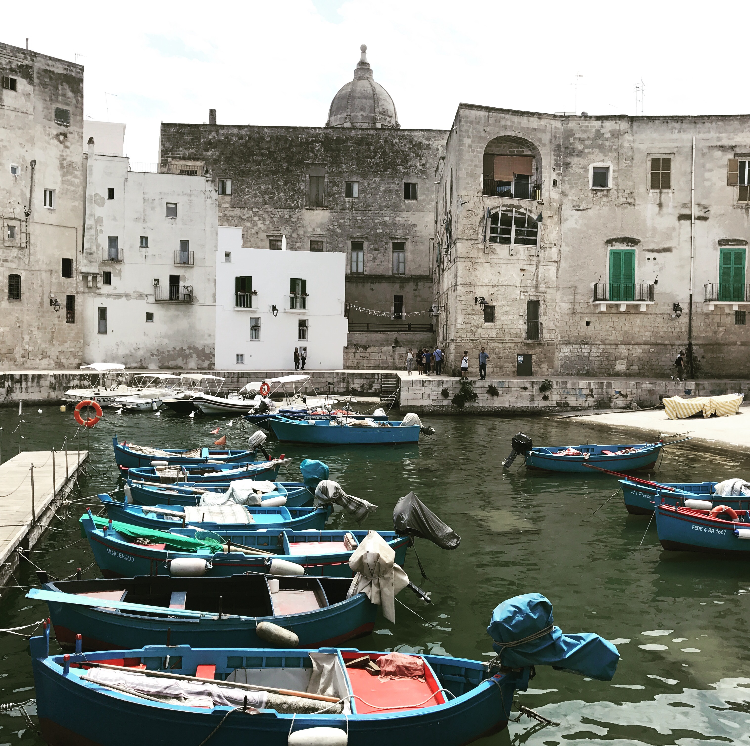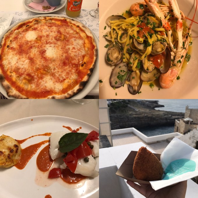Sundays are very quiet in Puglia, with many shops and attractions closed. The train schedule is also less frequent. Therefore, I decided to visit Polignano’s neighbor, Monopoli. Similar to Polignano, Monopoli is a bit edgier, but every bit as lovely. It is also a quick, five minute, train ride from Polignano. From the train station, I walked to the harbor and then to the beach and through the old town. I also had an amazing pizza with fresh buffalo mozzarella at Ristorante Pizzeria Regina Margherita.