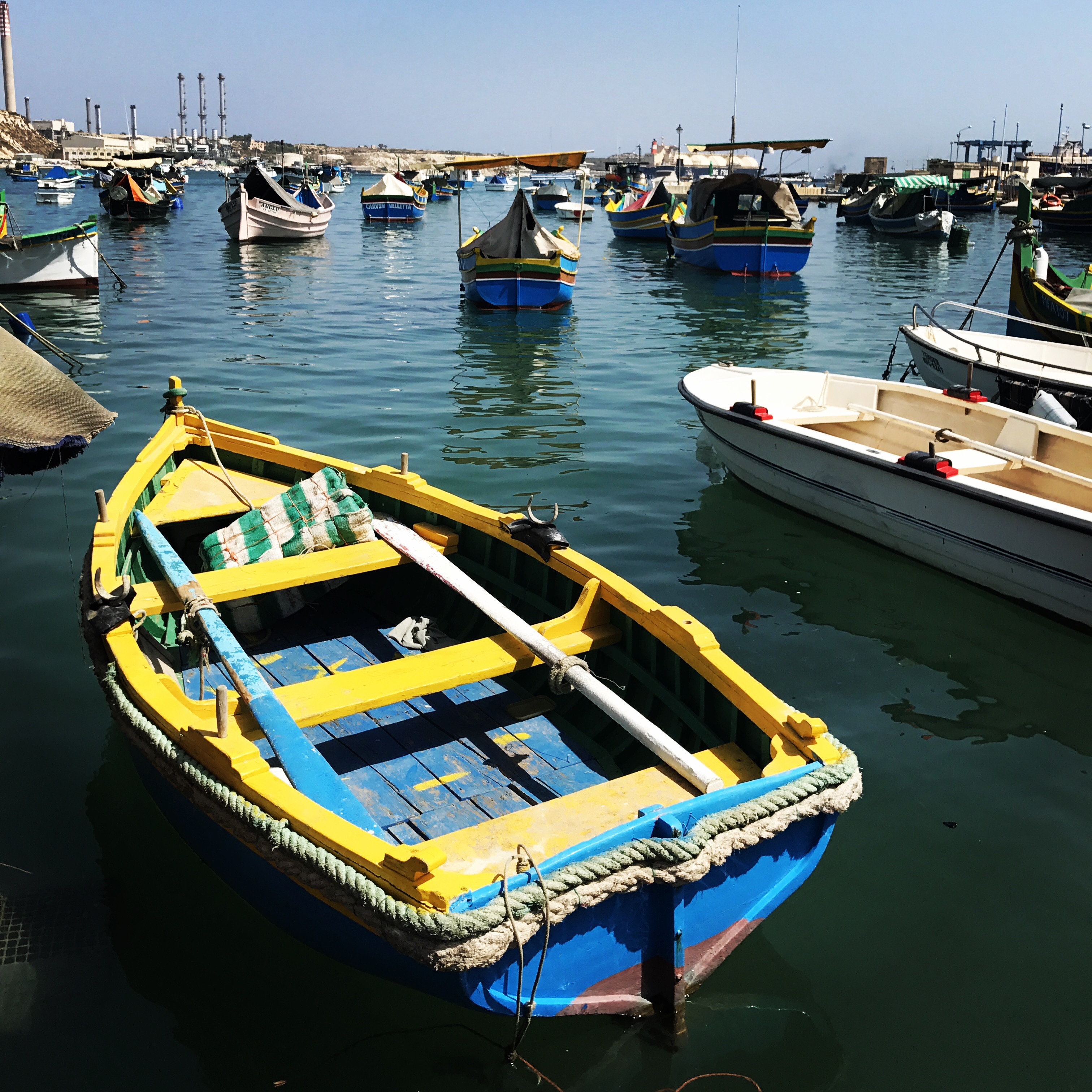 We also checked out Marsaxlokk, a tiny fishing and market town full of brightly colored boats. The boats (Luzzos) colors symbolize sky (blue), sun (yellow), land (green) and has an eye on it to protect the fishermen.